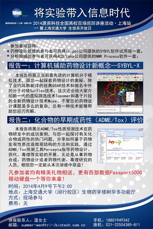 2014年3-10月份,源资科技将在全国范围内的各大高校、科研院所等进行巡回讲座,内容涵盖生命科学中的药物设计与数据分析、材料科学中的计算模拟、分析化学中的谱图分析和数据管理等。届时将有工程师介绍专业领域内的前沿进展,并现场解答您科研中遇到的问题。目前上海站活动已经确定,详情如下,欢迎参与。