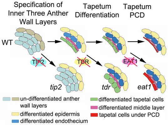 梁婉琪带领研究小组分离鉴定到了水稻中一个新的bHLH家族转录因子TIP2,该基因参与控制花药发育早期花药壁内三层细胞的分裂分化行为。TIP2在早期花药营养细胞层中特异表达,tip2突变体花药壁的内三层不能正常分化,后期中层和绒毡层不能正常降解,导致小孢子母细胞发育停滞。在内三层营养细胞层分裂完成后,TIP2通过激活另一个bHLH转录因子TDR,并与TDR形成蛋白复合体促进绒毡层的细胞分化。在小孢子母细胞完成减数分裂后,TIP2促进第三个bHLH转录因子EAT1的基因表达,TDR与EAT1形成新的蛋白复合体调节绒毡层的程序性死亡过程。该项研究揭示了水稻花药中由三个bHLH蛋白TIP2, TDR和EAT1组成的级联调控体系,该体系在水稻花药壁细胞层分化、发育和降解等关键节点中起到转换开关的作用。