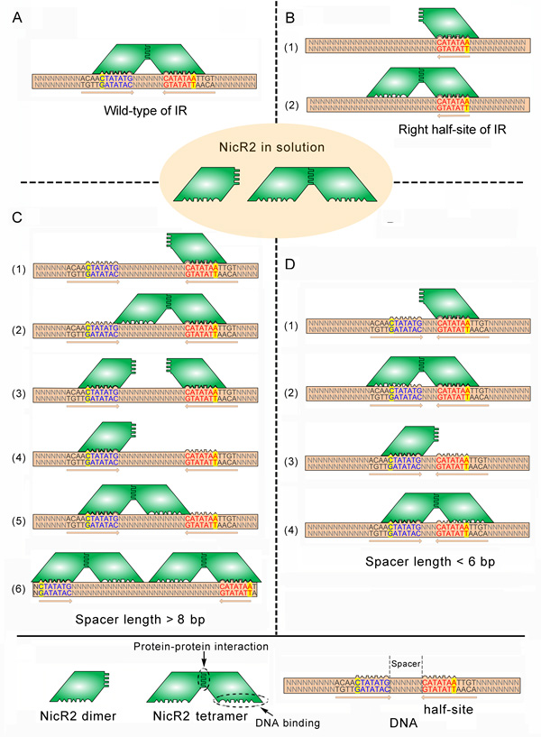 在烟草加工过程中会产生大量富含尼古丁等烟碱类化合物的固体和液体废弃物,易进入地下水对环境造成一定的影响,因此降低烟草废弃物中尼古丁含量对于维护人类的健康和环境保护有着重要的意义。恶臭假单胞菌S16能够以尼古丁作为底物生长并将其完全矿化,在降低烟草中尼古丁含量和处理烟草废物的过程中发挥重要作用。课题组成员通过研究假单胞菌属中参与重要环境毒物尼古丁分解代谢的一个新的调控蛋白NicR2与DNA的结合方式,发现NicR2虽然包含helix-turn-helix (HTH) motif,其结合DNA的方式却与β-片型调控蛋白类似。在此基础上,提出了一种新的HTH型调控蛋白结合DNA的模型。该研究成果《An unusual repressor controls the expression of a crucial nicotine-degrading gene cluster in Pseudomonas putida S16》以封面论文的形式发表在Molecular Microbiology上。