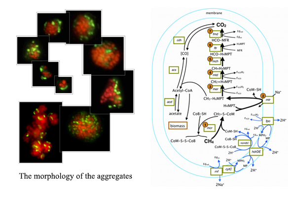 厌氧甲烷氧化过程(AOM, anaerobic oxidation of methane)每年消耗全球海洋中甲烷年产量的85%,是控制海洋中甲烷释放的关键步骤,直接影响着全球的气候变化。同时,AOM过程中标准吉布斯自由能理论计算值只有-16.6kJ/mol CH4,接近生物可利用的能量极限,是一个典型的深海极端环境中的低能量生物过程。在这一过程中起关键作用的微生物是一类暂命名为厌氧甲烷氧化菌的古菌(ANME, anaerobic methanotrophic archaea)。ANME生长缓慢,代增时间长达几个月,目前全世界尚没有实验室能获得ANME的纯培养。微生物海洋学实验室采用自主设计研发的深海冷泉模拟及低温高压微生物培养系统(目前已知的唯一一套正在运转的长周期气液混合高压流动培养系统)对海洋泥火山环境样本进行了长达三年的富集培养,得到了ANME-2的富集物。通过进一步的宏基因组、宏转录组、单细胞团分选和基因组测序分析发现甲烷产生途径中的所有关键7步酶的基因在ANME-2体内都存在并表达。同时,对ANME-2的能量代谢途径分析发现ANME-2细胞内不存在经典的氢酶,但是有Fpo,Hdr,Cytochrome C,Rnf等多种电子传递途径关键酶的基因表达,表明其能量代谢的多样性。该项研究从化学反应、基因组学和转录组学等多角度同时证实了厌氧甲烷氧化是甲烷产生的逆反应,并证明ANME-2进化出多样化的能量代谢机制以适应低能量环境并快速应对环境变化。