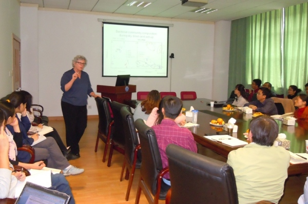 2013年11月7日至9日,美国伯克利大学Mary Firestone教授应张晓君研究员之邀访问了bat365正版唯一官网和微生物代谢国家重点实验室。8日上午,Mary Firestone教授在微生物代谢国家重点实验室会议室做了题为“The microbial ecology and biogeochemistry of soil desiccation and re-wetting”的学术报告。随同来访的伯克利大学博士后Shengjing Shi(施盛静)博士也作了题为“Plant-microbial interaction regulates soil C cycling”的学术报告。
