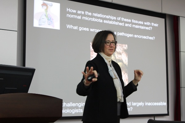 Mcfall-Ngai教授作了题为“Forming host-microbe partnerships: lessons from the squid-vibrio symbiosis”的报告,详细介绍了以夏威夷小墨鱼和Vibiro fischeri的互作机制,进而探讨了将小墨鱼模型研究推广至微生物与人类呼吸道系统相互作用的研究。Ruby教授以“A common polysaccharide underlies the complex conversation in the squid-vibrio symbiosis”为题,介绍了几丁质在Vibiro fischeri与夏威夷小墨鱼互作中发挥的重要作用及其可能作用机制。