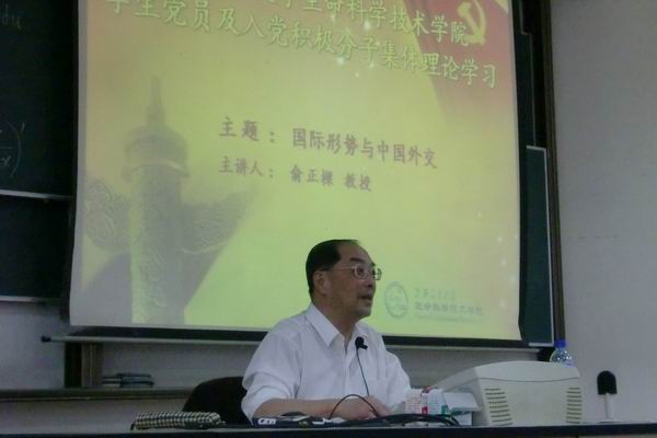 2011年5月11日,bat365正版唯一官网2010-2011学年第二学期学生党员及入党积极分子集体理论学习在东中院100号举行。原我校国际与公共事务学院副院长,中国国际关系学会副会长,上海国际问题研究所名誉顾问俞正梁教授应邀为此次集体理论学习主讲,bat365官网全体学生党员及入党积极分子、部分同学参加了本次学习。
