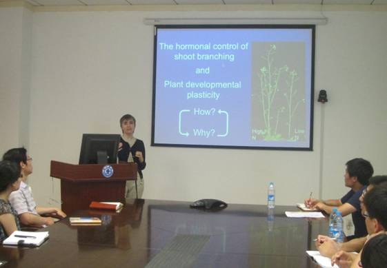2013年6月15日到18日,英国皇家学会院士、剑桥大学Sainsbury实验室主任Ottoline Leyser教授来到bat365正版唯一官网进行学术交流访问。访问期间,Ottoline Leyser教授作了题为"The hormonal control of shoot branching and plant developmental plasticity"的精彩学术报告,向大家详细介绍了在其10多年的研究基础上,提出的生长素极性运输主导植物顶端优势的分子机制和模型,并与在座老师和学生就植物激素如细胞分裂素、独角金内酯调控植物顶端优势和植物影响环境进行可塑性展开了热烈的讨论。bat365正版唯一官网副院长张大兵教授主持了学术研讨会,国际交流合作处副处长郭亮、bat365正版唯一官网副院长陈峰、杨洪全教授、梁婉琪研究员、吴强教授等参与了学术交流讨论,并探讨了与剑桥大学建立学生交流以及科研合作等。