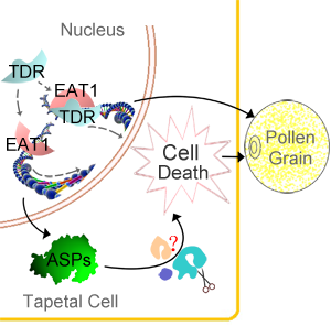 绒毡层是植物花药最内层壁,在小孢子发育过程中,逐渐死亡,为小孢子发育提供营养和能量。绒毡层是植物发育性细胞死亡的理想的模式组织。通过遗传学张大兵教授团队研究发现了一个在绒毡层中特异性表达的bHLH转录因子,EAT1,可以在转录水平上直接调节两个天冬氨酸蛋白酶(Aspartic Preotease,ASP)的表达。ASPs在酵母、拟南芥和烟草体内过表达,会造成细胞和组织的死亡,说明ASPs具有广谱的死亡促进者作用,而EAT1则是通过控制ASP表达执行死亡起始的作用。体内和体外实验证明EAT1蛋白能够与调控绒毡层细胞死亡的另一个bHLH转录因子,TDR(TAPETUM DEGENERATION RETARDATION,Plant Cell,全文下载:http://www.ncbi.nlm.nih.gov/pmc/articles/PMC1693939/)直接作用。张大兵教授团队2006年的结果证明,TDR通过直接调节一个半胱氨酸蛋白酶OsCP1(Cysteine Protease 1)的表达控制绒毡层细胞死亡。 基因表达分析结果表明TDR对绒毡层的发育调控可能部分通过EAT1实现; 有趣的是, EAT1不能直接调节OsCP1的表达,TDR也不能直接调节ASPs的表达。说明在绒毡层细胞死亡调控过程中,EAT1和TDR可能存在着不同的分工。这项研究为全面认识花粉发育以及细胞程序性死亡等生物学过程提供了新的认识(http://www.nature.com/ncomms/journal/v4/n2/abs/ncomms2396.html?WT.ec_id=NCOMMS-20130205) 。