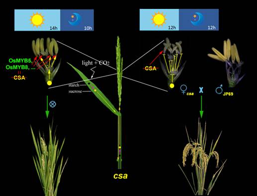 近年来张大兵教授团队发现csa突变体表现出光敏不育特性。csa在短日照的条件下表现为完全雄性不育,在长日照的条件下变现为雄性可育。进一步通过杂交将csa突变位点转入籼稻中,含有csa突变位点的籼稻也表现出长光条件下可育,短光条件下不育的特性,这表明CSA是一个光敏不育基因(见示意图)。该项研究为水稻杂交育种提供了一种新材料,可以克服现有三系、两系杂交水稻育种中不育系育性不稳定等问题;为阐明植物光敏雄性不育的分子机制提供基础。该项研究成果发表在《美国科学院院刊》(PNAS2012 December 19, 2012, doi:10.1073/pnas.1213041110)(http://www.pnas.org/content/early/2012/12/19/1213041110.full.pdf+html)。