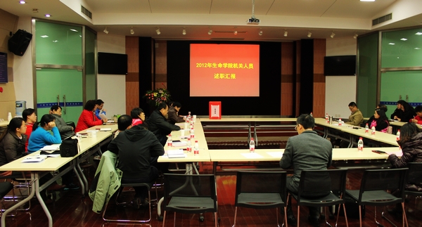 12月19日上午,bat365正版唯一官网在生物药学楼树华多功能厅召开2012年度机关工作人员考核会议。学院党政领导仰颐书记、张雪洪常务副院长、马小京副院长以及各系、所、中心书记和主任10余人出席并担任评委。