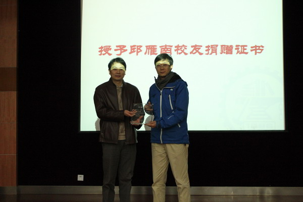之后,邱雁南校友与张雪洪教授为本次20名奖学金获得者颁发证书,鼓励他们继续自立自强刻苦学习,并与获奖者一一合影留念。其中研究生获奖者段磊同学代表所有获奖学生发言,感谢邱学长对母校学生的帮助,同时也向所有获奖学生发出倡议,承诺毕业工作后将秉承交大饮水思源之精神,尽己所能帮助母校学子。