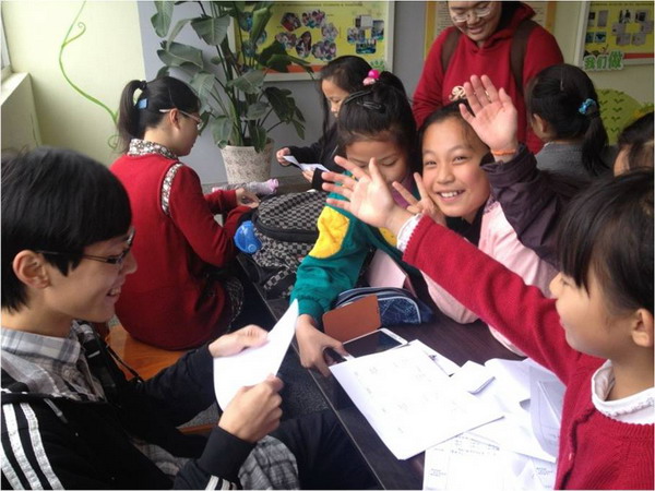 午餐时间刚过,同学们就纷纷来到志愿者身边,争相提问各种问题。“向日葵为什么向着太阳呢?”“世界上一共有多少种植物呀?”“人是怎么产生的?”“为什么鲸鱼生活在水里却是哺乳动物呢?”……同学们的问题五花八门,动物的、植物的、化学的、物理的,有的小同学看到志愿者用手机,立刻提问:“大哥哥,手机是谁发明的呢?”虽然做了充分的准备,同学们天马行空的问题仍然让志愿者们应接不暇。