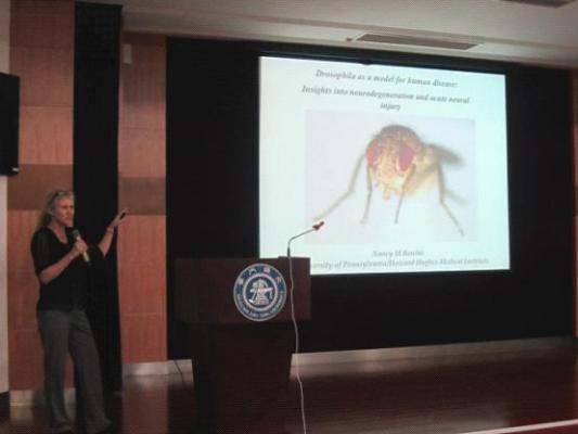 来自中科院上海植物生理生态研究所、bat365正版唯一官网、农业与生物学院、系统生物医学院和药学院的100多名师生参加了学术报告会议,学术报告由杨洪全教授主持。Anthony R Cashmore教授和Nancy Bonini教授分别为师生作了题为“Cryptochrome: A blue light photoreceptor involved in circadian rhythms in both plants and animals”和“Drosophila as a model for human disease: Insights into neurodegeneration and acute neural injury”的精彩学术报告,并与在座师生就基因功能、进化、实验体系选择等问题进行了热烈地讨论。