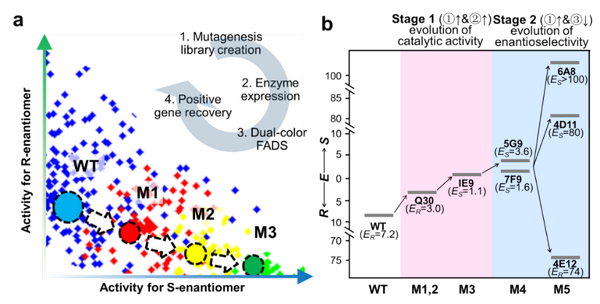 该研究建立了可以直接对酶立体选择性、底物选择性等复杂性质进行超高通量筛选的技术平台,有望极大提高酶定向进化的效率,促进生物催化、合成生物学等生物技术领域的发展。