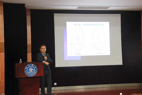 谷宝军从泌尿系统的结构和功能向留学生介绍了肾脏、泌尿系统和生殖系统相关知识,从预防、起因、症状、治疗、愈后五方面详细讲解了肾结石、肾积水、尿路感染等疾病,强调预防慢性肾病要从日常生活中的自我管理做起,合理膳食、适量运动,维持心理平衡,提出了如多饮水、多吃纤维谷物、控制肉类和草酸丰富的食物以及盐类的摄入、一天饮用牛奶不能超过三杯等具体建议。