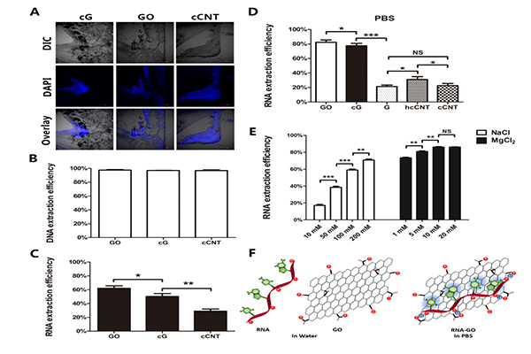研究团队基于碳纳米材料对核酸的吸附特性,通过比较氧化石墨烯(GO)、羧基化石墨烯(cG)、石墨烯(G)、高羧基化碳纳米管(hcCNT)和羧基化碳纳米管(cCNT)这五种碳纳米材料对核酸的吸附能力,发现相较于其他四种材料,二维的氧化石墨烯对细胞内的DNA和RNA有更高效的富集作用。研究进一步发现,在阳离子存在的条件下,氧化石墨烯通过自身携带的羟基和羧基可以吸附更多的RNA,从而更有效地富集RNA结合蛋白;同时,分离得到的核酸结合蛋白中超过88%的蛋白质被富集了两倍以上,表明氧化石墨烯对核酸结合蛋白具有高度选择性。该项工作创新性的建立了一种基于氧化石墨烯的富集核酸结合蛋白新方法,不仅可以同时富集DNA结合蛋白和RNA结合蛋白,且提取过程只需一分钟。