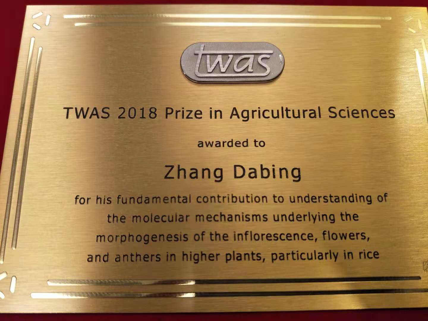 2018年11月27日,bat365正版唯一官网张大兵教授因其在高等植物,特别是水稻花序、花器官和雄蕊形态发生分子机制领域的重要贡献,荣膺发展中国家科学院(又叫第三世界科学院,The Third World Academy of Sciences,简称“TWAS”)农业科学奖。