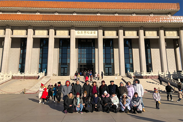 12月29日,19位师生聚集在天安门广场前,观看庄严的升旗仪式。城楼上嘹亮的军号响起,随着“正步走”的号令,护卫队员铿锵整齐的步伐走向国旗杆基座。师生们整齐肃立,高声唱起国歌。
