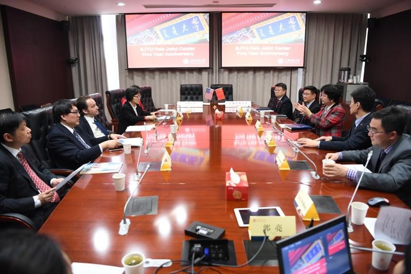 2019年3月22日,耶鲁大学副校长Pericles Lewis代表团访问上海交大参加“上海交大-耶鲁大学联合中心五周年学术交流会”以及“上海交大-耶鲁大学生物统计和数据科学联合中心”揭牌仪式。上海交大党委常委、副校长徐学敏在闵行校区会见代表团,bat365正版唯一官网党委书记嵇绍岭、副院长林双君,“上海交大-耶鲁大学生物统计和数据科学联合中心”联席主任吕晖等出席了活动。