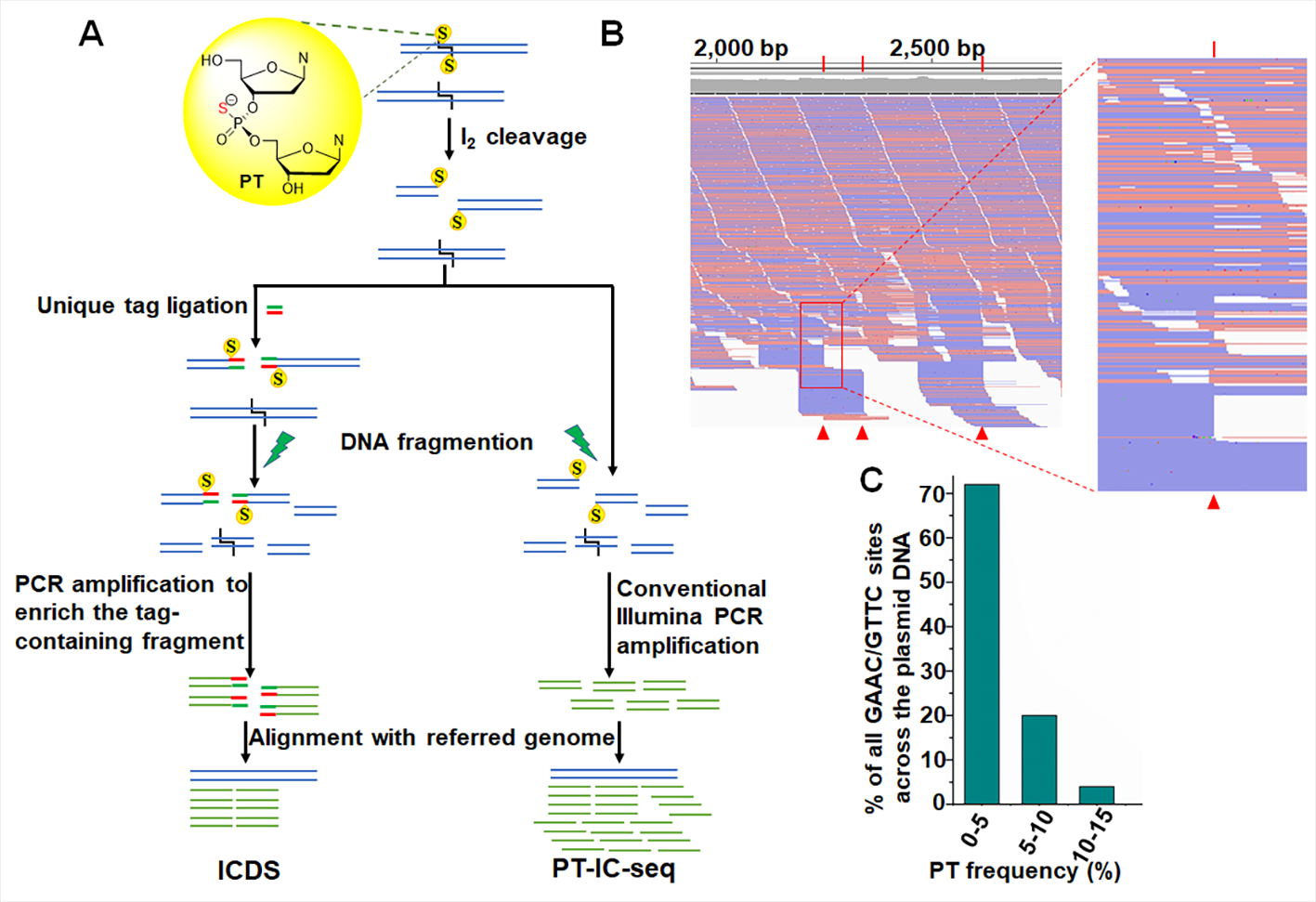 DNA是重要的遗传物质,储存着所有蛋白质和RNA的全部遗传信息。DNA上的任何一个微小的变化都有可能改变生命的遗传信息,影响生命活动,如经典的DNA甲基化修饰在生物界具有保护遗传稳定,调控DNA复制、转录以及翻译过程等重要功能。DNA磷硫酰化修饰是由中国科学家邓子新院士发现的,DNA骨架上硫原子取代磷原子上的非桥联氧原子形成一种新型DNA修饰。它突破了DNA由碳、氢、氧、氮、磷五种元素构成的结论,拓展了经典的DNA组成,引起了国内外广泛关注。多年来,围绕这一新型DNA修饰的探索已逐步形成了一个全新的研究方向,是我国在基础生命科学研究领域的一个重要的原创性贡献。2014年,由德林教授研究组利用单分子实时测序和碘切割依赖的测序技术绘制了大肠杆菌基因组DNA磷硫酰化修饰图谱,但这种新型DNA修饰的基因组分布规律和修饰频率尚未知。