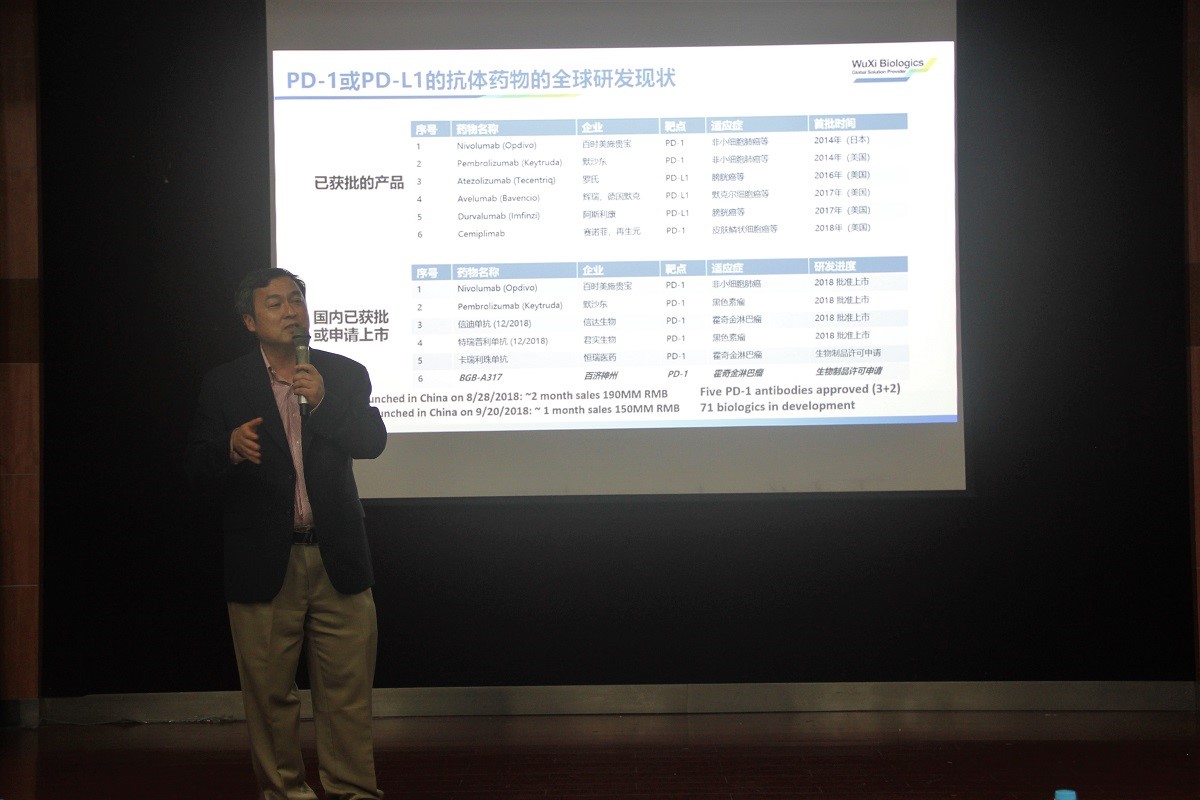周伟昌作题为《打造世界顶尖生物药技术平台,变革全球生物产业》的产业报告。周博士介绍了生物医药研发领域的发展现状、未来趋势,中国的原创贡献和药明生物生物药研发生产技术平台。在提问环节,同学们积极向周博士了解生科学子进入生物医药研发产业需要具备的技能,及如何弥补中国与国际生物药研发之间的差距。