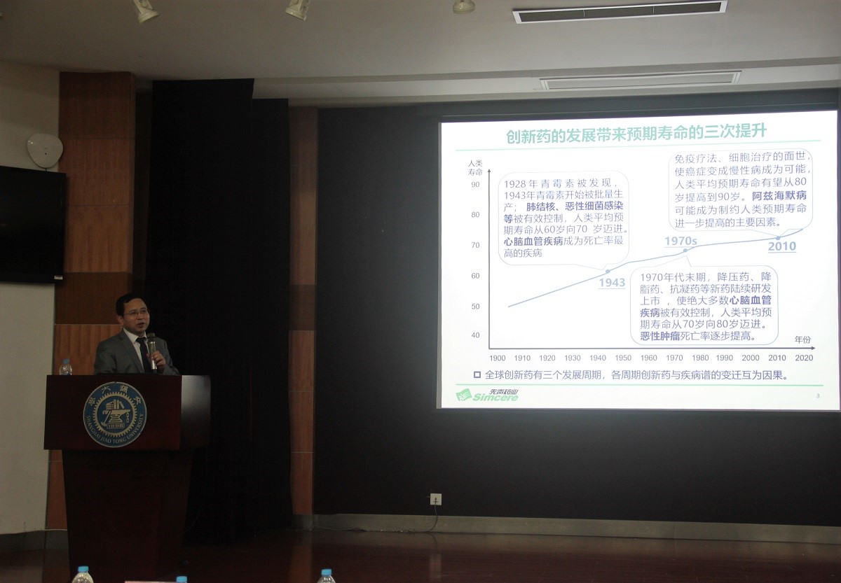 徐向斌作题为《中国新药研发现状及发展趋势》的产业报告,介绍了创新药的三个飞跃、中国医药研发现状、中国医药研发高速发展态势及机遇、中国医药研发的不足和挑战、免疫治疗和细胞治疗的发展情况和先声药业的基本情况等方面内容。在提问环节,同学们与徐博士积极交流,得到了许多启发性的见解。