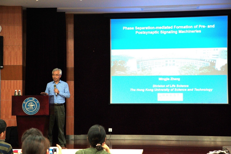 报告中,张明杰教授以浅显平实的语言向师生们介绍了实验室的重要成果。张教授首先讲述了PSD中高丰度表达的两个蛋白PSD-95与SynGAP的生物化学的研究,他们意外的发现PSD中高丰度表达的两个蛋白PSD-95与SynGAP,在体外较高浓度下(远高于其生理浓度)可以发生液-液相分离(liquid-liquid phase separation,LLPS)进而形成高度浓缩的PSD-95/SynGAP聚集体。重要地是,引起自闭症的SynGAP或PSD-95功能缺陷突变可改变PSD-95/SynGAP浓缩相的形成以及神经元的突触信号活性。结合此研究发现与突触的特性,他们推测突触中高丰度表达的多结构域支架蛋白,通过结合膜锚定的离子通道/受体,可能也可以发生液-液相分离进而自发形成类似PSD的蛋白聚集体。通过体外重组方法,他们证实了这一猜想,相关工作以发表在国际著名期刊《CELL》上。这项工作提示神经元中高度致密的PSD很可能通过特异蛋白的相分离自发形成并稳定存在。该相分离介导的PSD类似结构具有与均一溶液相大相径庭的特性,却刚好契合突触的功能,对于理解突触的建立、维持与动态调节具有重要的指导意义。尽管该体外重组的PSD类结构仅包含几个组分,但作为一个简易有效的分子平台,可以与在体实验相结合,进一步探索PSD其他组分调控PSD动态组装的功能。