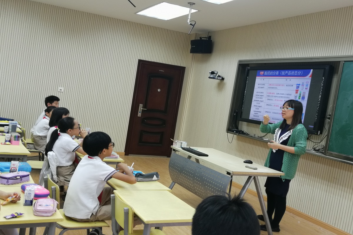 随后,光明乳业研究院党支部苏永红经理向大家介绍了酸奶和乳制品相关知识,从酸奶的发酵流程到酸奶的营养成分再到饮用酸奶的注意事项。同学们都爱喝酸奶,也曾经在课堂上做过酸奶,今天听到更多的酸奶的知识都十分感兴趣。酸奶里面的生牛乳成分是多少,酸奶为什么不能加热了再喝等问题又开始引起同学们的认真思考和热烈讨论。光明乳业的同志还为每位小朋友准备了酸奶和儿童奶酪,大家边听报告,边体验产品,整个教室充满了孩子们欢快的笑声和热烈的讨论声。