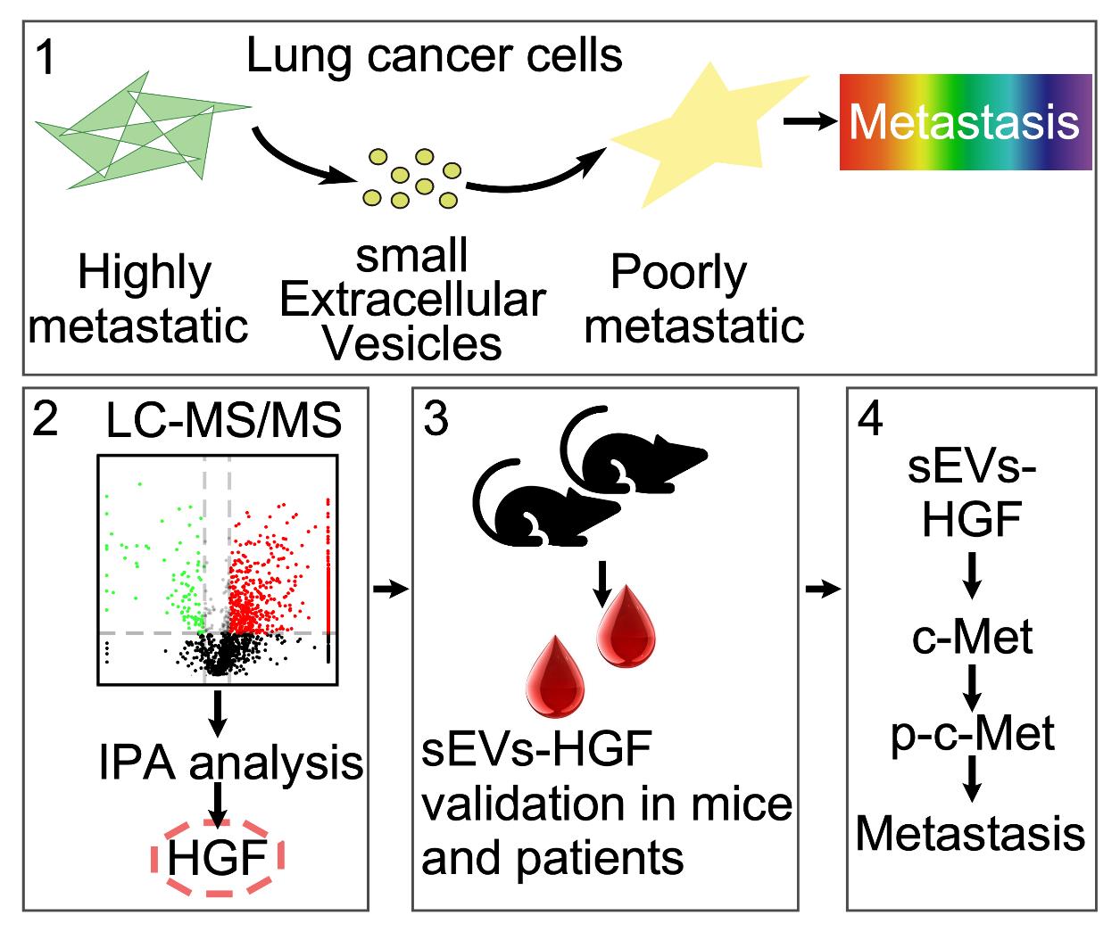 研究人员首先以高转移肺癌细胞和低转移肺癌细胞为研究对象,发现高转移肺癌细胞分泌的细胞外小囊泡可以促进受体细胞的增殖和侵袭能力,经实验论证,其原因可能是因为高转移肺癌细胞分泌的细胞外小囊泡激发了受体细胞的上皮-间充质转化,从而增强了受体细胞的转移能力。研究人员通过基于质谱的定量蛋白质组学技术,比较了高转移肺癌细胞和低转移肺癌细胞分泌的细胞外小囊泡蛋白质组差异,数据分析提示差异变化蛋白主要参与细胞运动,研究人员进一步分析发现,在高转移肺癌细胞的细胞外小囊泡中HGF蛋白呈高表达,考虑可能是潜在的关键因子。