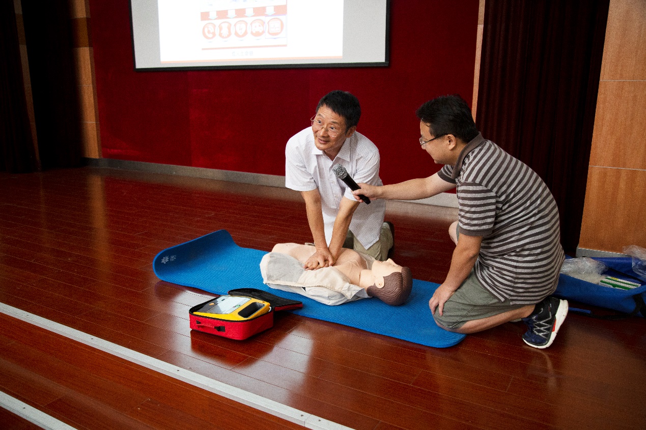刘金生做2019年新生医疗安全培训,并与许杰一起展示了心肺复苏术,指导新生们借助模型,现场进行了模拟实践。