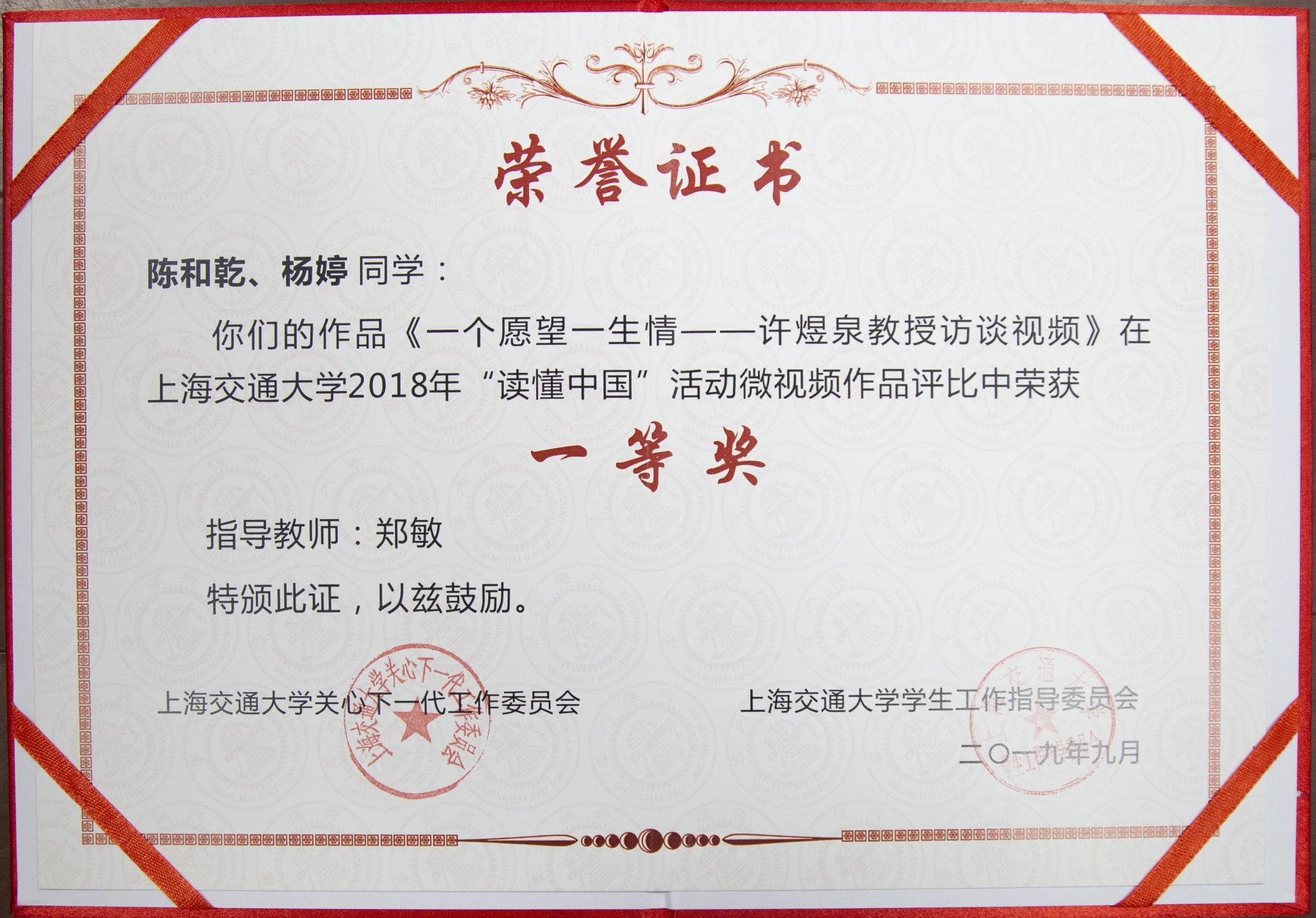 《一个愿望一生情——许煜泉教授访谈视频》及《开拓进取 敢为人先——朱章玉教授访谈视频》荣获bat365正版唯一官网2018、2019年“读懂中国”活动微视频作品一等奖。