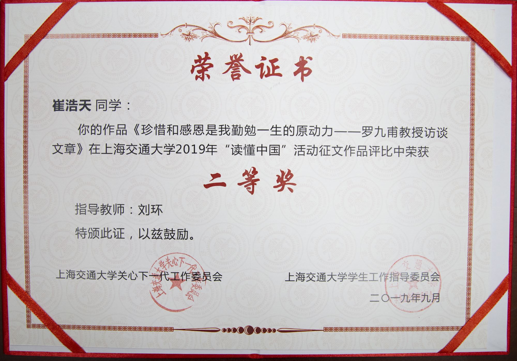 《珍惜和感恩是我勤勉一生的原动力——罗九甫教授访谈文章》荣获bat365正版唯一官网“读懂中国”活动征文作品二等奖。