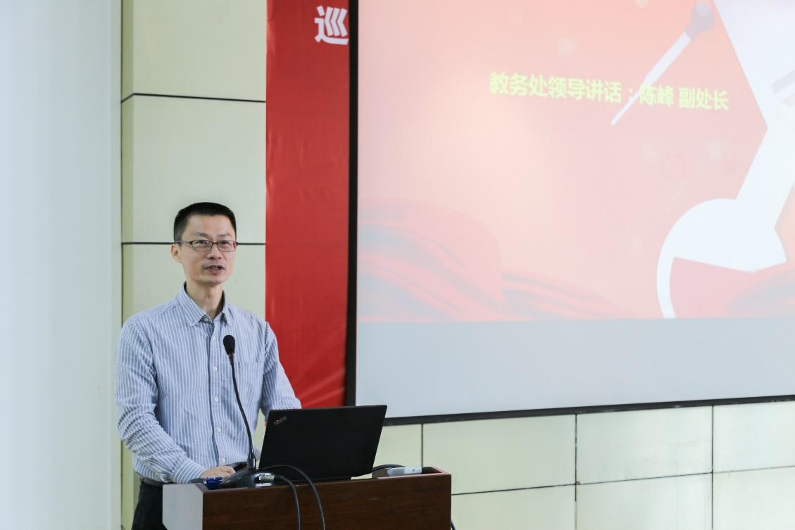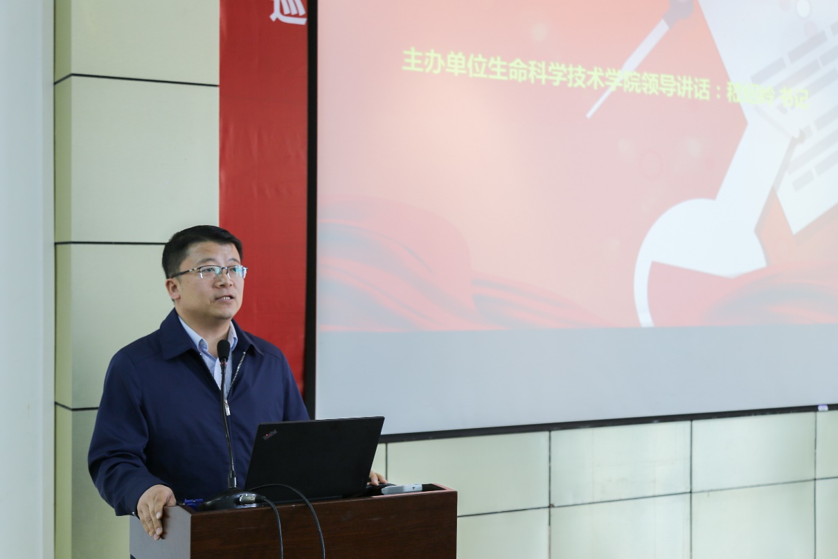 陈峰教授讲话。他介绍了“全国大学生生命科学竞赛”与“全国大学生生命科学创新创业大赛”这两大国赛的基本情况,希望通过此次校内竞赛遴选出优秀的团队参加国赛,鼓励未来有更多的同学参与到竞赛中,开拓思维、乐于创新,通过这一平台培养良好的科研素养,提高自身的综合能力。