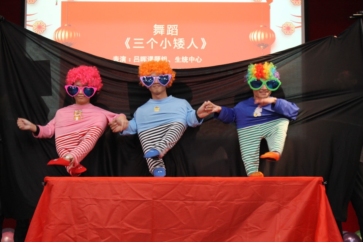 联欢会由幕布戏舞蹈《三个小矮人》拉开帷幕。一张黑色的布由两位同学拉开,隐藏了六位同学在幕后,只在幕前露出三面化妆后的联孔,六人双手充当三个小矮人的手脚,在《失恋阵线联盟》的音乐中开始了欢快的舞蹈。现场的气氛一下被点燃,现场充满了欢声笑语。