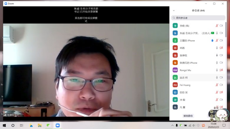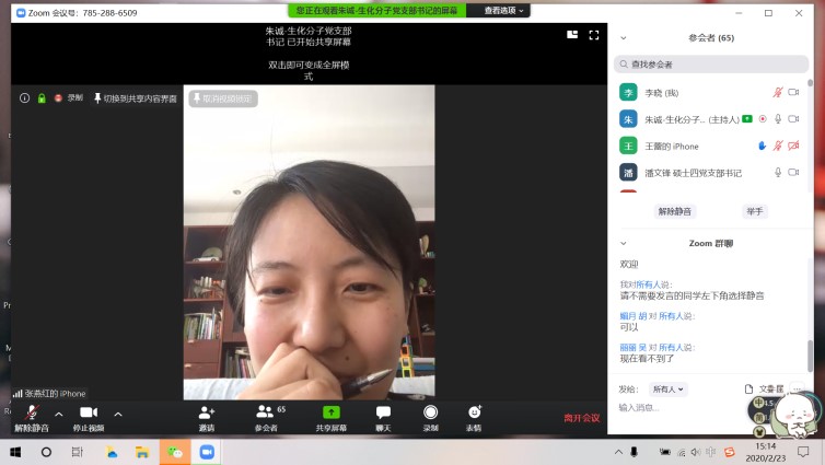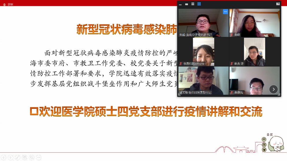 2020年2月23日,针对目前新型冠状病毒肺炎疫情防控的严峻形势,bat365正版唯一官网生物化学与分子生物学系研究生党支部与医学院硕士第四党支部联合召开线上专题组织生活会。医学院研究生办公室主任翁律侃、辅导员杨璐,bat365正版唯一官网学生党总支书记张燕红、特邀党建组织员陆秀英及两个支部72位学生党员共同参会,会议由生化系研究生党支部书记朱诚主持。