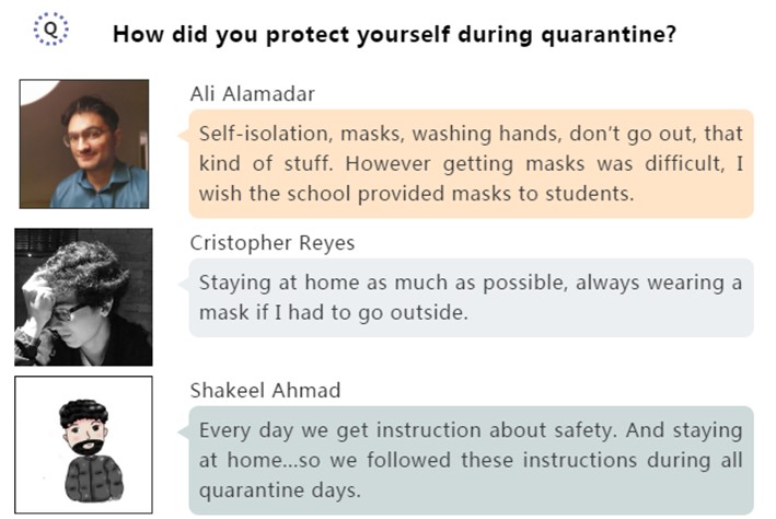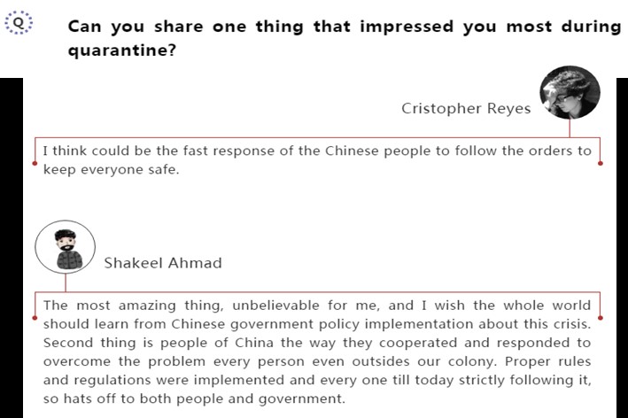 访谈分别以线上文字和视频交流两种形式进行。在采访中,主持人分别针对留学生隔离期间的防护措施、学习生活与见闻感受等问题进行提问和交流。留学生们就各自的居家隔离日常进行分享,也表达了他们对于疫情的看法。其中谈及留学生在疫情隔离期间感受最深的事,留学生们纷纷表示对中国政府强有力的抗疫举措表示称赞。大家诉说着心中的美好愿景,共同盼望着能够早日在交大校园里重逢。
