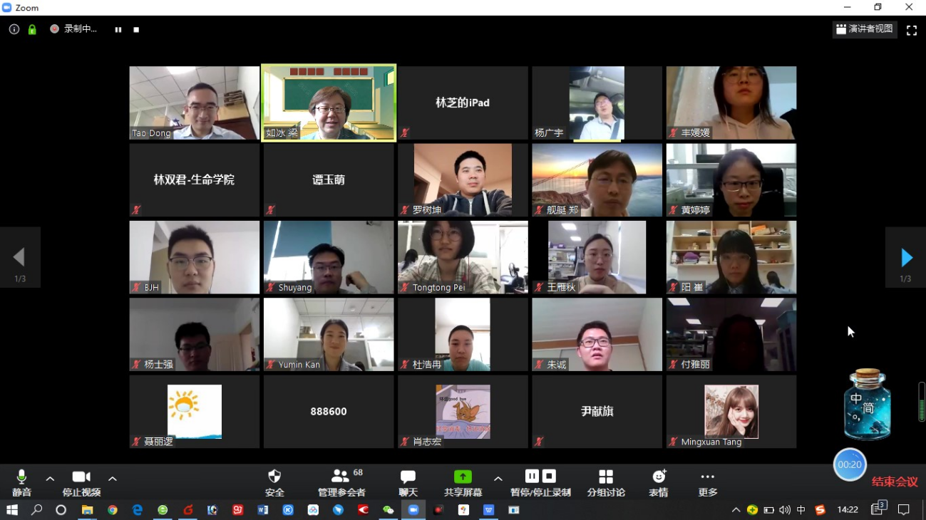 此次在线交流活动立足问题启发、热点讲读与前沿引领,分为微生物代谢与互作、核酸修饰与检测、蛋白功能与进化及结构生物学四大模块进行在线互动交流。从2020年4月22日到5月13日为期一个月,每周举办一次,向学院全体师生开放。依托ZOOM在线平台,来自生物化学与分子生物学系8个课题组的8名研究生先后进行了展示。bat365正版唯一官网副院长林双君、生物化学与分子生物学系系主任董涛、副主任梁如冰、支部书记刘昱以及丁伟、黄婷婷、唐满成、吴更、由德林、杨广宇及学院其它系所老师全程参加活动。活动主要由梁如冰主持,每场活动的参会人数均达100人左右,生化系在读研究生全程参会。活动采取学生在线展示与参会人员交流互动相结合的形式进行,每位同学进行二十分钟展示后,导师与参会同学进行二十分钟的提问与交流。每位同学围绕已有工作的进展、问题与展望及拟开展新课题的想法等进行全面陈述,导师依据其学术创新性、数据挖掘度与工作展示度等,给予点评与指导。