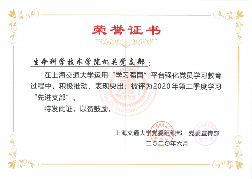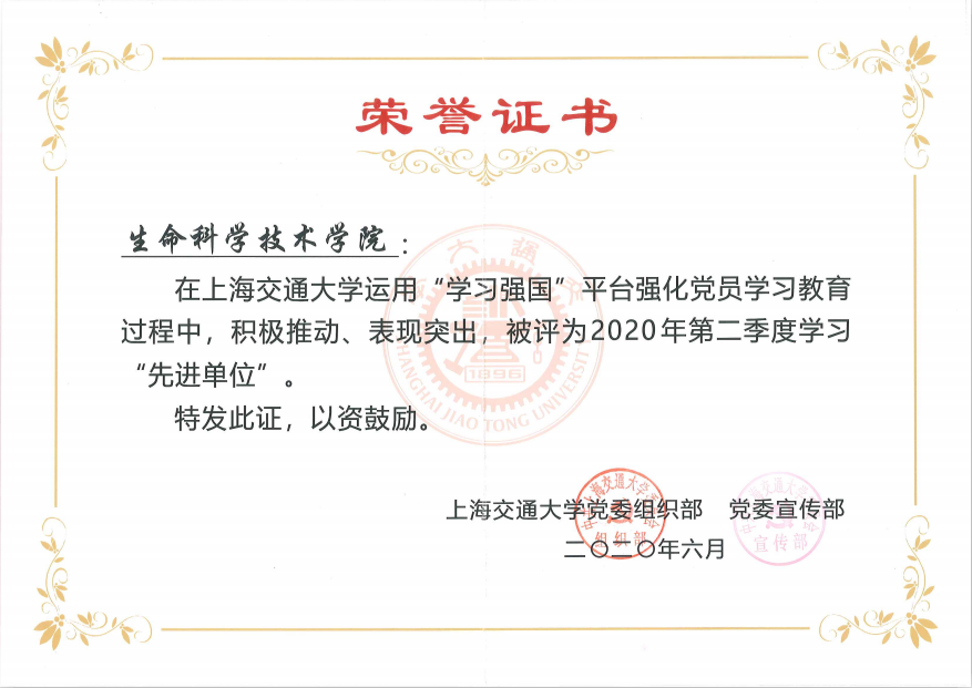 在bat365正版唯一官网2020年第二季度“学习强国”学习先进单位、先进党支部、先进个人评选中,bat365正版唯一官网获评第二季度学习“先进单位”,机关党支部获评学习“先进党支部”,微生物科学系生化系研究生联合党支部 周子画、本科生党支部 陈星宇、遗传与发育科学系研究生第一党支部 石垒、Bio-X研究生第一党支部 陈志堂、生物信息学与生物统计学系研究生党支部 毛雪莹、机关党支部 张燕红、生物信息学与生物统计学系研究生党支部 田晓翩、遗传与发育科学系研究生第一党支部 冉晓茹、Bio-X教工党支部 杨峰平、Bio-X研究生第一党支部 车曼菊10名党员同志获评bat365正版唯一官网2020年第二季度“学习达人”荣誉称号。