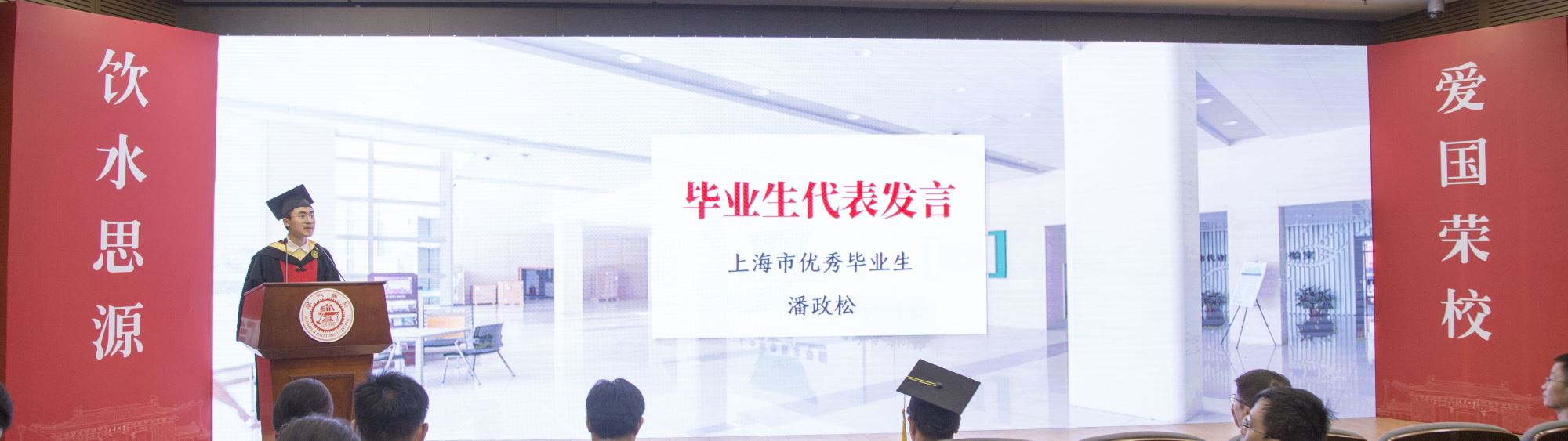 研究生毕业生代表、上海市优秀毕业生樊文杰发言,她对学院的悉心栽培、老师的用心教导以及家人朋友的倾心支持表示感谢,希望同学们以后不论身处何方,都要对国家有忠诚与热爱、对社会有责任和奉献、对事业有目标和激情,为实现中华民族的伟大复兴奉献自己的力量。本科生毕业生代表、上海市优秀毕业生潘政松发言,他结合自己大学成长经历以及新冠肺炎疫情的影响,明白了只要能稳扎稳打、抓住机遇、乘势而上,才能开创属于自己的一片天地,他希望同学们共同努力,凭借“后浪”不服输的探索精神,找到所热爱的事业,实现人生价值。