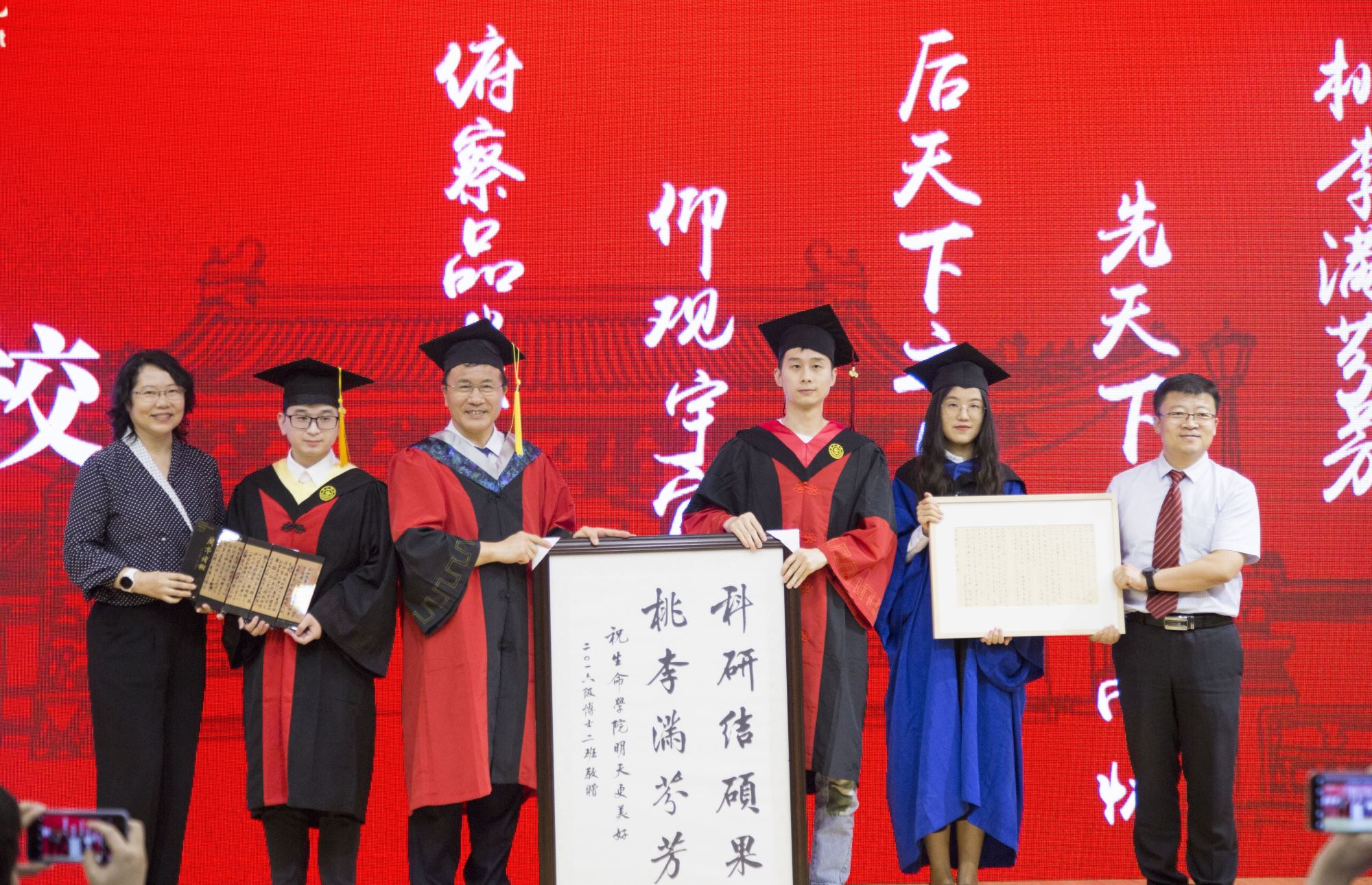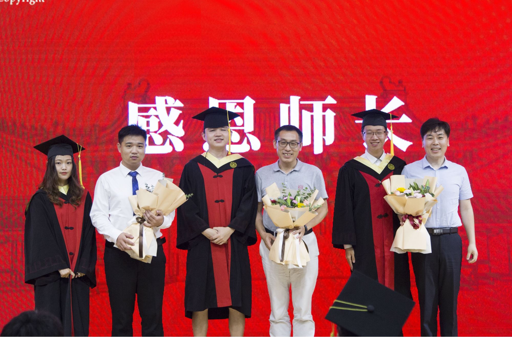 崔浩天等3位毕业生代表为班主任、班导师和导师代表献花,感谢他们对学生们的无私关爱和教导。本科生何思炀、硕士生樊文杰、博士生张旭代表毕业生们向学院赠送离别礼物。