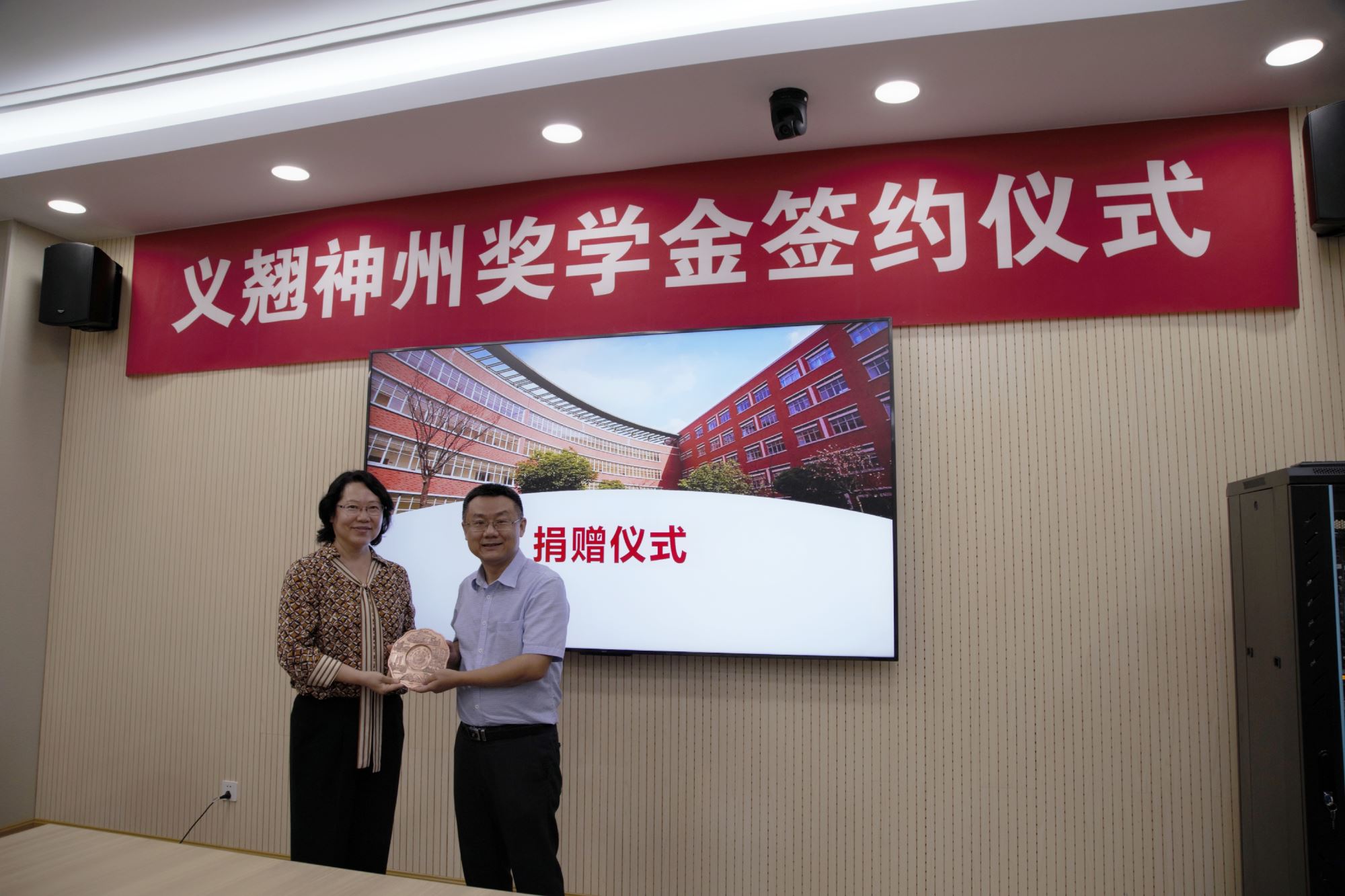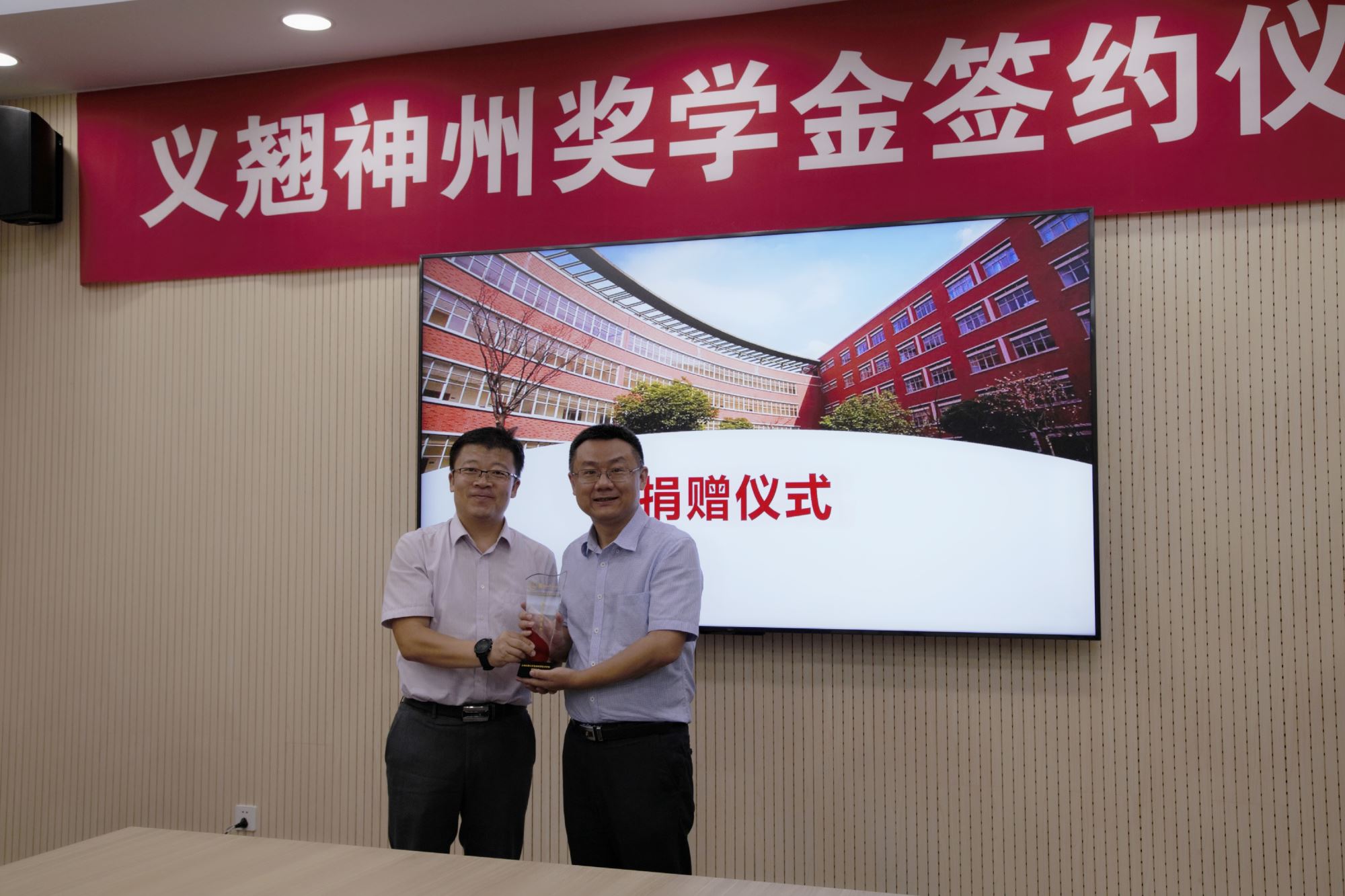 捐赠仪式上,程骄杰、嵇绍岭、冯雁代表bat365正版唯一官网向捐赠方北京义翘神州科技股份有限公司颁发了捐赠证书、义翘神州奖学金水晶杯及校景铜盘,感谢捐赠方对教育事业的支持。