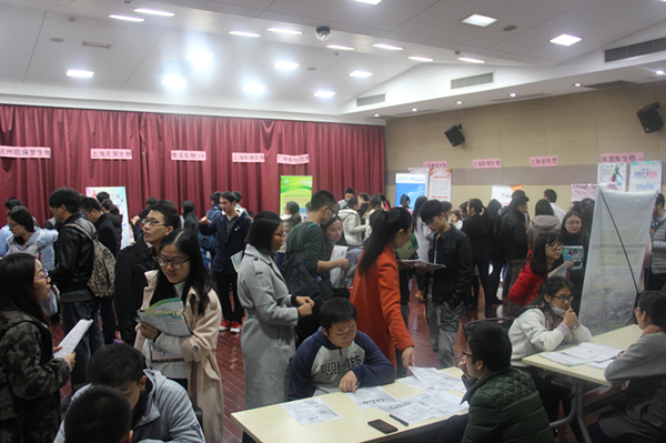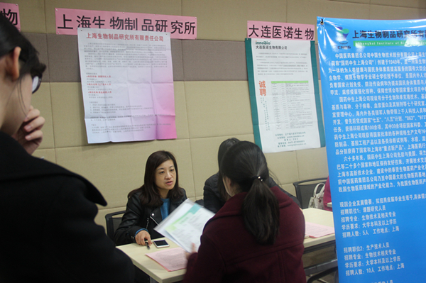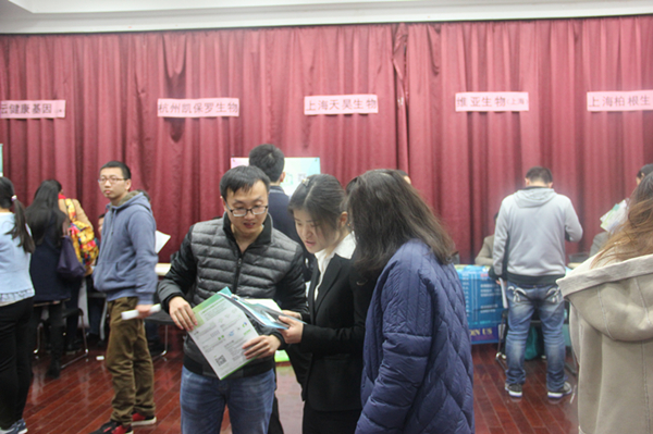 招聘会现场气氛火热,参展单位有知名国企和外企。同学们手持精心准备的自荐书和简历,穿梭在求职的人流中,积极同招聘人员交流,主动了解用人单位的招聘情况。上海生物制品研究所有限责任公司、成都生物制品研究所有限责任公司、上海药明生物技术有限公司等多家企业招聘展位前人气高涨,尤其受到同学们的青睐。
