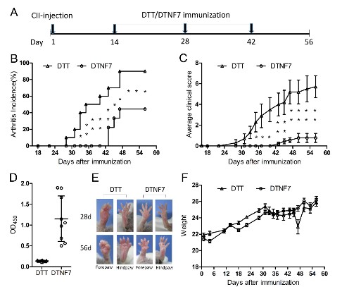 研究人员在CIA小鼠关节炎模型中测试了该疫苗的治疗效果,发现相比于对照组(DTT)可以明显推迟关节炎的发病15天,最终有90%的关节炎模型小鼠发病而DTT对照组仅有45%发病。令人意外的是,该疫苗产生的针对天然TNF-α的特异性抗体可以维持长达6个月的时间,并且几乎绝大多数抗体为IgG1型抗体,相比于对于其他在研疫苗针对的效果具有显著的进步,对类风湿关节炎这种慢性炎症性疾病的治疗也具有明显优势。研究团队目前正在继续开展该疫苗的临床前研究工作并且希望早日进入临床实验。