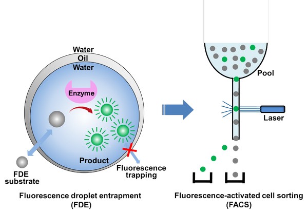 为解决此问题,研究团队提出了一种被称作“荧光液滴捕获(Fluorescence Droplet Entrapment, FDE)”的酶底物设计新策略。他们通过调节底物和产物分子疏水性的变化,来控制分子在微液滴内的扩散行为,从而提高筛选体系的准确度。具体来说,经过FDE设计的底物分子结构具有较高的疏水性,可以自由通透油相进入微液滴内部与酶进行反应;在酶促反应后,底物被转化为具有较高亲水性的荧光产物,由于其高亲水性,荧光产物被困在微液滴内部无法扩散出,从而可以准确地定量反映微液滴内部的酶活性。在使用磷酸三酯酶进行的模式筛选实验中,经过单次筛选即可将阳性细胞在大量无酶活性的阴性细胞中富集900倍以上,显示了FDE底物设计方法的高效性。本研究还进一步探讨了FDE底物设计方法的通用性,对于酯酶、脂肪酶、磷脂酶、糖苷酶、蛋白酶、肽酶等重要工业酶的FDE底物设计方案提出了建议,为进行更大规模的酶快速定向进化铺平了道路。