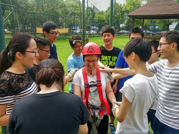 专题培训以“突破自我,扬帆远航”为主题,旨在引导本科毕业生党员加强团队合作,鼓励他们在今后的人生道路上勇于突破自我。在“空中抓杠”项目中,学生党员既要克服自身的恐惧,在十米高空勇敢往前跳跃,又要把自己的人身安全完全托付给由其他党员组成的安全保障团队。在“生死共存”项目中,两人一组的合作快速有效地建立起同伴之间的信任。