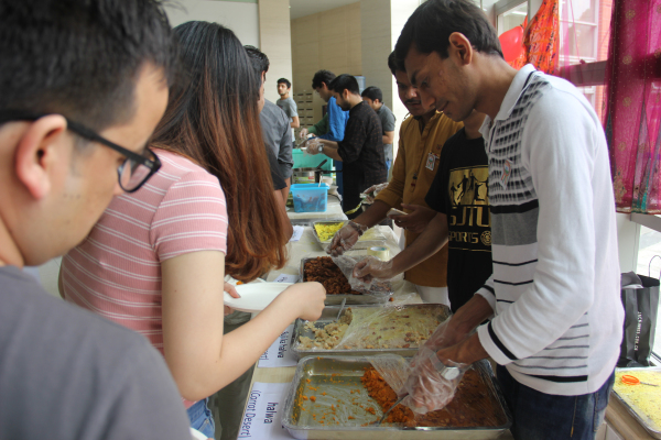 印度美食的摊位前一直排着长龙队伍,吸引了很多同学前来品尝。印度留学生们非常热情地邀请大家积极尝试,并细心地注释了各种食材,方便大家进一步了解。