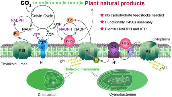 蓝藻具有与植物叶绿体相近的光合组分,使得其成为表达外源植物基因的理想宿主。许平团队对聚球藻PCC7942进行了遗传改造,使其含有植物源酶,获得了一批可以生产系列苯丙烷类化合物的工程菌株。苯丙烷类化合物对植物至关重要,可以防护紫外线和防御病原菌。其中,当重组蓝藻表达酪氨酸解氨酶、对香豆酸CoA合酶以及芪合酶时,可以产生白藜芦醇。这种物质多见于葡萄皮和其他浆果类,可以减少心脏疾病的风险,是一种高值的药物。其他的工程菌还能够生产抗氧化剂咖啡酸、柚皮素和对香豆酸等高药用价值化合物。此外,研究团队通过解反馈抑制酶的引入使得这些化学物质的产量大大提高。
