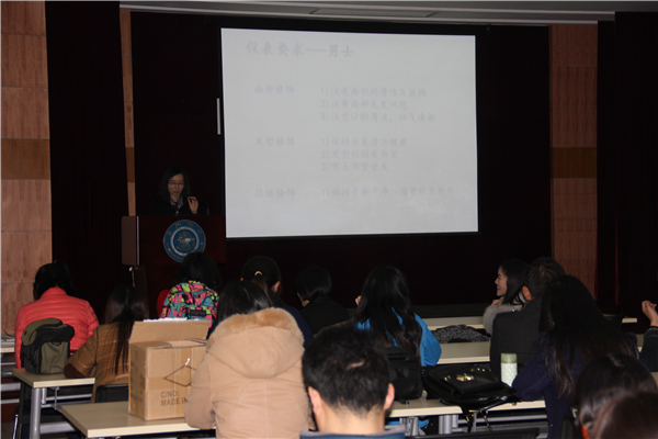 崔美花老师语言幽默诙谐,讲解细致入微,着重强调了职场上需要注意的礼仪规范,从服装打扮到言行举止等都做了生动详尽的介绍。活动现场,同学们被崔老师的优雅举止所吸引,纷纷就自己求职中遇到的就餐礼节、称呼等问题积极提问,崔老师都一一进行了详细的解释。