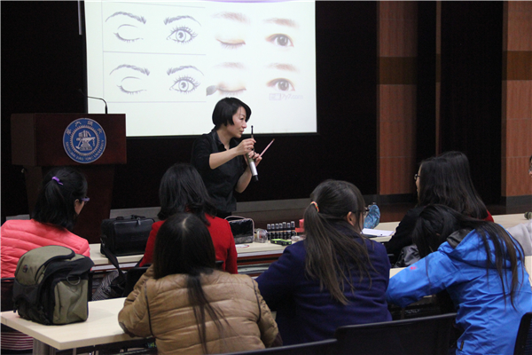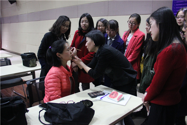 李俊彦老师详细给大家介绍了职场妆容化妆要点和化妆品的挑选问题。李老师强调职场妆容应尽量以舒适自然为主,不能过分妖艳。活动现场,同学主动担当模特,李老师做现场化妆演示,现场操作与讲解并行,在场人员听得入神。