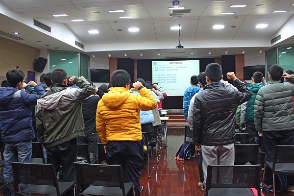 在观看了一部关于考试诚信的宣传动画之后,刘环结合同学们本学期以来的学习情况和问题,通过往年的真实案例告诫同学们一定要坚守原则,不要存在侥幸心理。她要求同学们抓紧时间,认真复习备考,做到诚信考试,拒绝作弊。随后,年级助理姚杰同学发出诚信考试倡议,带领全体2015级同学做诚信应考宣誓。谭晶还现场回答了同学们对选课和教育计划的疑问。