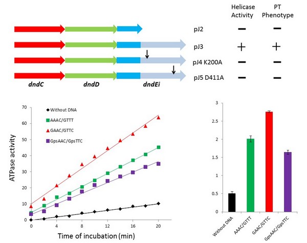 本研究通过对R. anatipestifer来源的磷硫酰化修饰基因DndEi生化性质和体内功能的全面分析,系统阐述了dndEi在DNA磷硫酰化修饰中的作用。研究表明DndEi中多出的结构域具有DNA解旋酶活性,体内缺失该结构域导致DNA磷硫酰化活性丧失,证明了该结构域对DNA磷硫酰化修饰是必需的。研究还发现DndEi具有ATP酶活性,并且,含有GAAC/GTTC序列的DNA片段能极大的促进DndEi的ATP酶活性,而GAAC/GTTC正是DNA磷硫酰化修饰的保守序列。该研究首次揭示了DNA解旋酶参与DNA磷硫酰化修饰,为进一步深入理解DNA磷硫酰化的生物化学过程奠定了重要基础。