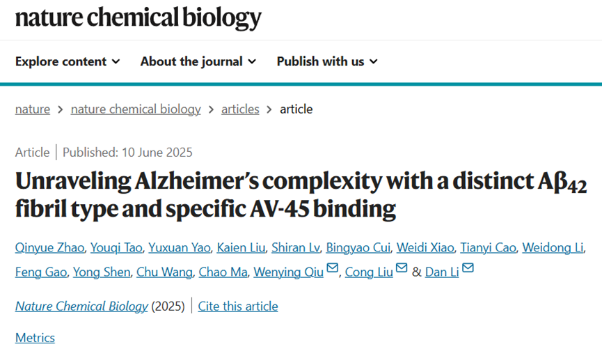 2025年6月11日,bat365正版唯一官网Bio-X研究院李丹团队、中国科学院上海有机化学研究所生物与化学交叉中心刘聪团队,联合中国医学科学院基础医学研究所仇文颖团队,在Nature Chemical Biology期刊上发表了题为“Unraveling Alzheimer's Complexity with a distinct Aβ42 Fibril Type and Specific AV-45 Binding”的研究论文。该工作在AD患者脑组织“可溶组分”中发现全新的Aβ42病理纤维聚集体类型(Type III),并首次阐明临床PET示踪剂AV-45识别Aβ42的分子机制,为AD的精准分子分型与新一代PET示踪剂的研发提供了理论依据与新思路。