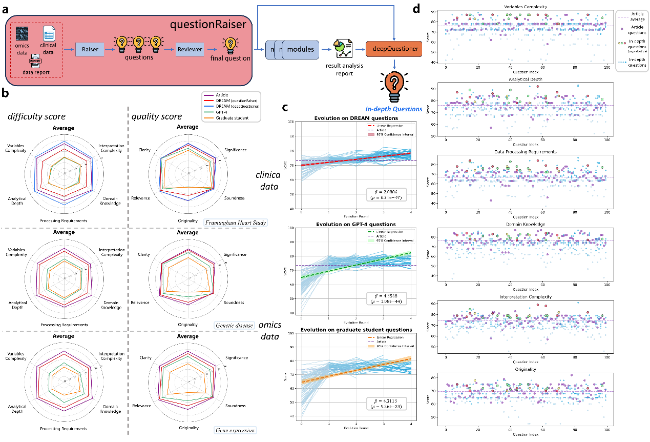 近日,由bat365正版唯一官网生物信息与生物统计学系和转化医学研究院数字医学技术中心联合完成的一项研究成果成功发表于 Advanced Science。三位共同一作为bat365正版唯一官网致远博士生邓罗佳,博士生吴艺杰,以及转化医学研究院实验师任永永博士,bat365正版唯一官网特聘教授吕晖为通讯作者。团队提出并构建了一个真正“能自己做科研”的智能系统——DREAM(Data-dRiven self-Evolving Autonomous systeM)。自此,AI不只是工具,更是探索未知世界的合作者,在科学的边界上描绘属于下一代科研文明的梦想。